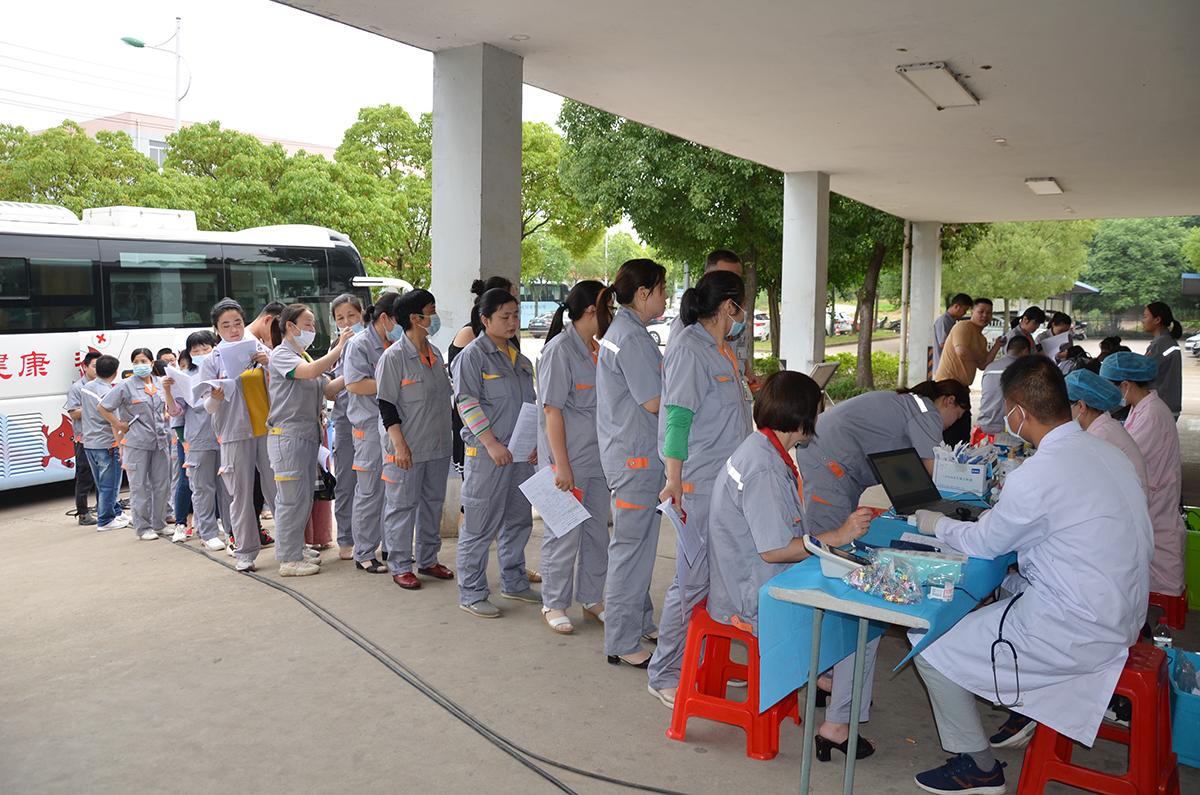 清晨,初夏的阳光洒满工厂,大地熊献血志愿员工早早等在公司献血现场,大家热情洋溢、井然有序地排起长队,在市中心血站的工作人员指导下填写个人信息、体检、献血。